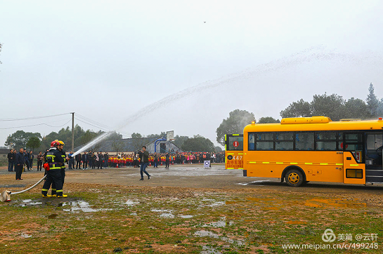 本次演练模拟校车在接送学生途中发生撞击交通事故,造成油路或电路故障,引发初起火灾。
