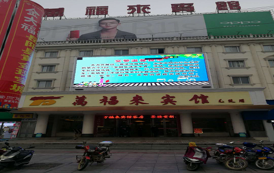 在城区最集中的万福来宾馆电子显示屏上,占有大幅标牌,滚动播放十五天。“尊法守纪明礼,安全文明出行”的宣传标语。