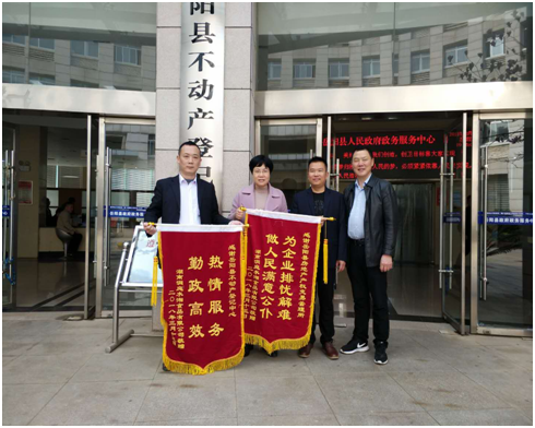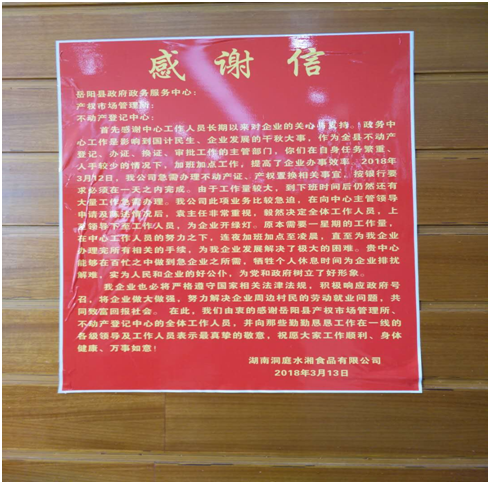 15日,洞庭水乡食品有限公司总经理带着锦旗和感谢信来到政务中心向岳阳县产权市场管理所和不动产登记中心的全体工作人员表示由衷的感谢。中心全体工作人员将继续做好为人民服务,争做人民满意的公仆。