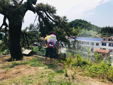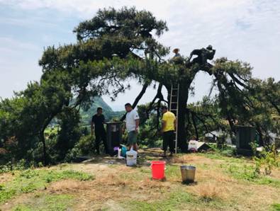 11日,县林业局森防站、绿化办、月田林业站等技术员对该古松进行集体会诊,制订出“三位一体、标本兼治”救护方案进行防治和保护,一是对树冠表层及周边马尾松喷洒速杀灭丁、菊马乳油等综合药剂;二是悬挂松褐天牛诱捕器,诱杀天牛,谨防天牛携带松材线虫病源,侵害古松;三是在树干及主支部位悬挂复合营养液,补充营养,驱杀树体虫害;四是因古松生长环境恶劣,表层土壤贫瘠,营养及水分供给不足,针对上述情况,以冠幅伸展范围为基准,挖坑填埋复合有机肥料,确保足够养份供应。