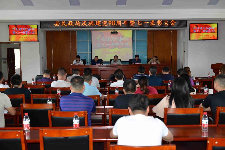 6月26日下午3点,县民政局举行庆祝建党98周年暨七一表彰大会,民政局党组全体成员、局机关和各二级机构全体党员参加会议,会议由党组副书记、副局长许波主持。