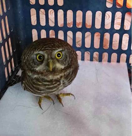 据林业站副站长李平介绍,这只猫头鹰是他上山巡视发现的。当时猫头鹰脚被一些绳丝栓住了,动弹不得。他马上把猫头鹰带回家,放置一舒适笼子里,小心翼翼地用剪刀剪开其脚上的绳丝。当时猫头鹰充满敌意,不配合,尖锐爪子把他的手抓出了血。