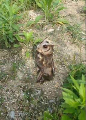 该站李平说 4月29号我在山上检查松毛线虫病的枯死木发现,稻田里有天网,天网上有鸟撞在上面,我走近一看是猫头鹰,和几只小鸟,我就把它们救了下来,把天网撕了,猫头鹰身上都是丝线缠着,然后我就把它带回了站里,用剪刀慢慢给它把线剪了,还给它吃了猪肉,第二天我看猫头鹰很活泼,就给他放飞了,4月29号的样子我们也同样又放飞了一只猫头鹰,也是丝网上救的,所以我们很多时候都在林间巡查,村民种菜怕鸟吃就放了天网,我们每发现一处都会让村民把网收了,现在有了很好的改善,好多村民也表示不再放网捕杀鸟了。