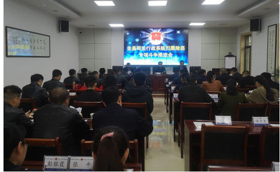 3月28日上午,岳阳县司法局在三楼会议室召开全县司法行政系统“扫黑除恶“专项斗争推进会。司法局党组书记、局长程立斌,副局长胡鹤鸣,党组成员兰双虎,各股室负责人,司法所长,收治中心负责人,律师事务所负责人等全体干部职工参加。