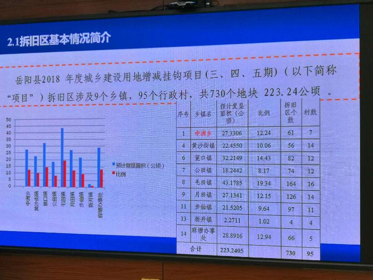 岳阳县2018 年度城乡建设用地增减挂钩项目(三、四、五期)拆旧区涉及9个乡镇,95个行政村,共730个地块。项目建设规模223.24公顷,预计减少建设用地面积223.24公顷,新增农用地223.24公顷,其中水田45.34公顷,占建设规模的20.31%,旱地50.90公顷,占建设规模比例22.80%,林地106.39公顷,占建设规模比例的47.66%,其他农用地20.60公顷,占建设规模比例的9.23%;项目总投资2940.36万元。确保了全县范围内建设用地总量不增加,耕地面积不减少、质量不降低,用地布局更合理的目标。