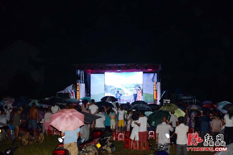演出活动在欢快的腰鼓表演中拉开序幕,独唱《习主席寄语》、小品《回娘家》、花鼓戏对唱《歌唱共产党》、舞蹈《今天是你的生我的祖国》《大王叫我来巡山》等12个节目快乐上演,尽管中途下了一阵小雨,并没有给演出“降温”,热情的观众依然冒着雨为演员们加油鼓劲。