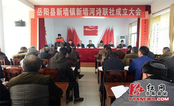新墙河畔,凯歌高奏;祝福伴掌声,荣誉耀花环;新-逢盛会,盛世传佳音。2015-1-10,岳阳县新墙河诗联社成立大会在新墙镇清水村隆重举行。岳阳县委宣传部副部长王创新,湖南省诗词学会副会长、岳阳市诗词学会会长汪德辉,湖南省诗词学会副会长、岳阳市楹联学会会长杨克辉,岳阳县诗词协会会长周麦秋、岳阳县诗联协会第一会长晏军辉、新墙镇党委书记黎晓军出席成立大会并讲话,县文联,市、县诗词、楹联协会相关负责人与80余名诗词爱好者参加成立大会。会议由新墙镇人民政府镇长李革伟主持。