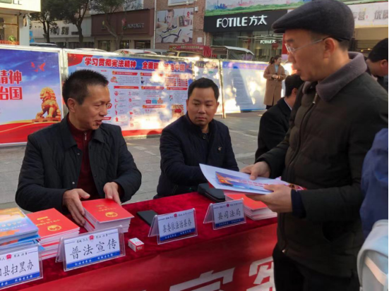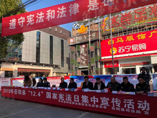 2019年12月4日上午,岳阳县司法局联合县政法委、县检察院、县公安局、县交通局、县文广旅新局、县妇联、县市场监督管理局、县应急管理局、城管局、忠民律师事务所在东方圣世广场开展了以“弘扬宪法精神,推进国家治理体系和治理能力现代化”为主题的宪法宣传日活动。