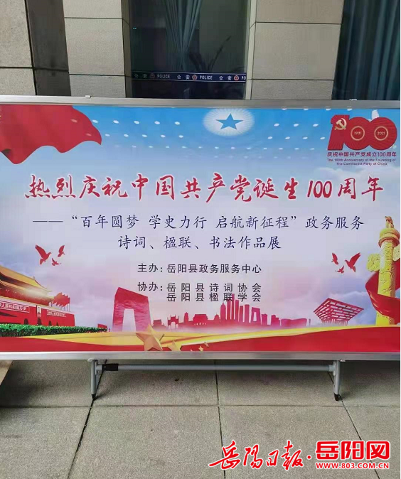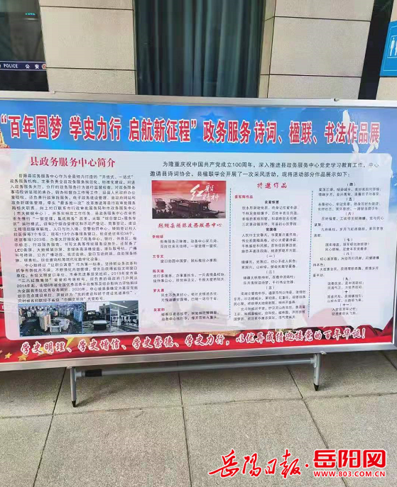 岳阳日报全媒体讯(通讯员 张谦)6月23日下午,岳阳县诗词楹联协会的老师们走进县政务服务中心,开展“百年圆梦 学史力行 启航新征程”庆七一采风创作活动。出席此次活动的还有中国毛体书协名誉副主席王石生、市楹联学会会长杨克辉以及岳阳县委组织部、县委宣传部领导。