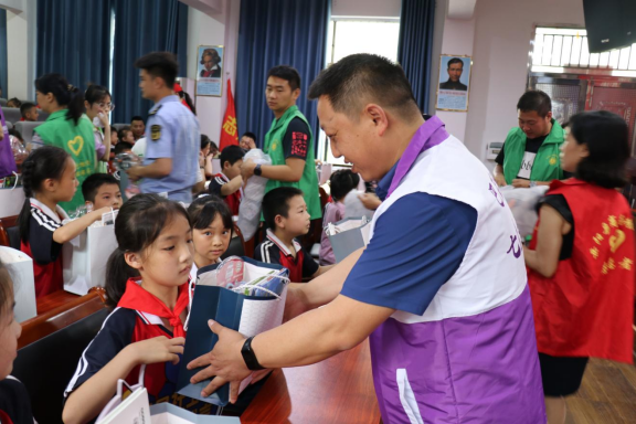 岳阳县民政局志愿者们带领社工和其他志愿者为参与活动的90个留守儿童分发“六一”礼包和小礼品,礼包里包含绘本、学习用具、跳绳、大水杯等礼物,孩子们高兴地抱着礼包不撒手,脸上乐开了花。