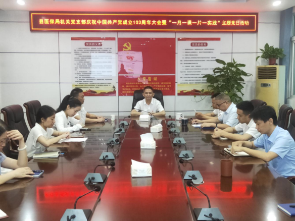 6月28日上午,岳阳县医疗保障局召开庆祝中国共产党成立103周年大会暨“一月一课一片一实践”主题党日活动。本次大会旨在激励局党员干部不忘初心、牢记使命,进一步坚定信念,勇于担当,奉献发展,积极投身到新时代医保事业的建设中。局班子成员、机关党支部党员、入党积极分子等30余人出席会议。会议由局党组成员、副局长吴京向同志主持。