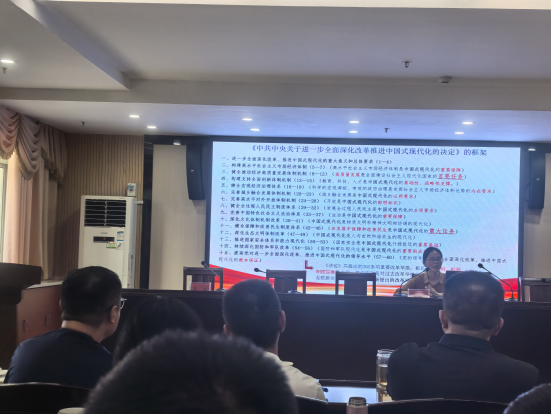 9月25日下午,根据县委统一安排部署,学习贯彻党的二十届三中全会精神县委宣讲团报告会在岳阳市生态环境局岳阳县分局举行。岳阳县委理论宣讲团成员、县委党校社会培训科科长朱美玲到会宣讲。报告会由岳阳市生态环境局岳阳县分局党组书记、局长高波主持。