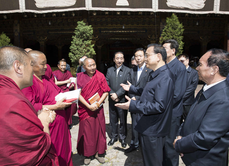 李克强总理7月26日下午来到拉萨市大昭寺看望慰问西藏宗教界爱国人士。始建于653年的大昭寺是西藏现存最辉煌的吐蕃时期寺庙建筑。李克强向西藏广大宗教界爱国人士致以诚挚的问候和衷心的祝福。他说,大昭寺是藏传佛教的圣殿,同时见证了汉藏和亲、民族团结的光辉历史。希望西藏广大宗教界爱国人士要以历辈高僧大德为榜样,为维护祖国统一、民族团结、社会和谐作出有益贡献,促进宗教和睦、佛事和顺、寺庙和谐。祝愿大家精修得道、身体健康、扎西德勒!