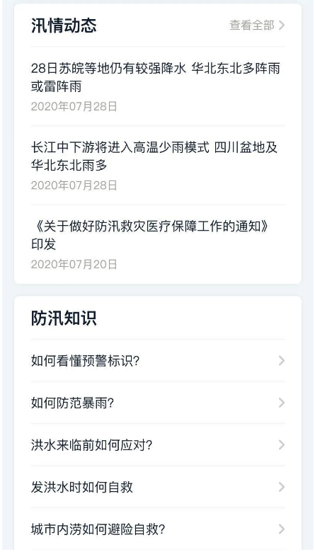 为帮助灾情严重地区群众及时掌握灾害预警信息、实时了解水情信息,提前做好防备;同时帮助大家普及防汛知识,防患未然,国务院客户端小程序联合水利部制作了防汛服务专区。