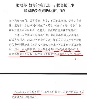 日前,西安交通大学、中央财经大学、上海财经大学、大连海事大学等多所高校研究生院发布消息:依据《财政部教育部关于进一步提高博士生国家助学金资助标准的通知》(财科教〔2017〕5号)文件要求,从2017年春季学期起,提高全国研究生招生计划内的全日制博士生(有固定工资收入的除外)国家助学金资助标准,其中中央高校博士生从每生每年12000元提高到15000元,即每生每月提高250元。
