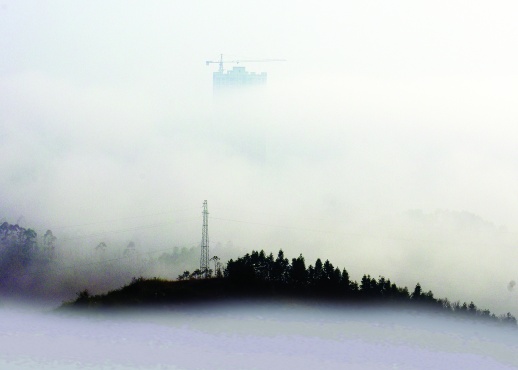 1月22日,雾漫中的嘉禾县新城区。当天,该县新城区出现平流雾景观,高楼大厦被雾气环绕,若隐若现,宛如仙境。平流雾是当暖湿空气平流到较冷的下垫面上,下部冷却而形成的雾。黄春涛 摄