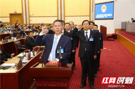 2018年10月23日上午,湖南省十三届人大常委会第七次会议决定任命的8名省政府组成人员进行宪法宣誓。