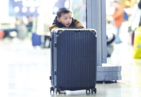 2月10日,长沙火车南站,小朋友把行李箱推进候车大厅。图/记者杨旭