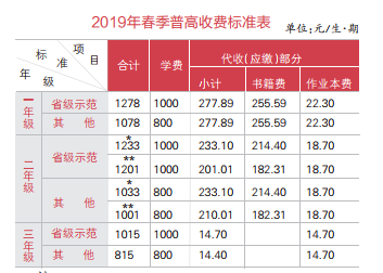 普通高中学费标准分省级示范性高中和其他高中两个档次。普高省级示范一年级1278元,二年级文科1233元、理科1201元,三年级1015元;其他普高一年级1078元,二年级文科1033元、理科1001元,三年级815元。记者发现,与2018年春季收费标准相比,高中阶段,除三年级收费标准保持不变外,其他一、二年级的收费都降了一元。