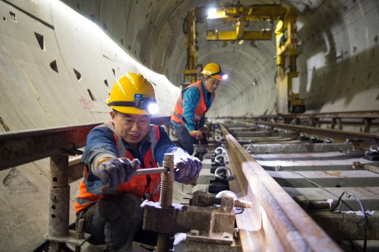 2月22日,长沙地铁5号线白茅铺站,工人正在铺轨施工。傅聪 摄