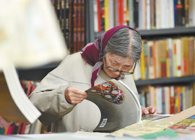 2019北京书市上,一位老人在认真挑选图书。人民网记者 翁奇羽摄