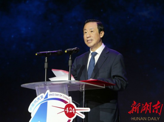 许达哲在致辞中表示,湖南一贯支持航空航天产业发展,坚持把发展航空航天产业作为打造创新型省份、建设制造强省的重要内容。新中国成立70周年之际,在伟人故里举办“中国航天日”主场活动意义深远,有利于湖南进一步营造创新氛围、推动创新发展。湖南将继续弘扬航天精神,大力实施创新引领开放崛起战略,发挥“一带一部”区位优势和人才优势、创新优势、产业优势,加快建设岳麓山国家大学科技城和马栏山视频文创产业园,积极承担国家重大项目,参与航空航天国内外合作和中国航天助力可持续发展十大行动计划,做强做优做大航空航天产业,为建设航天强国贡献湖南力量。