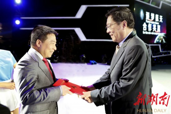 (省委书记杜家毫在开幕式上为航天公益形象大使颁发聘书。湖南日报·华声在线记者 罗新国 摄)