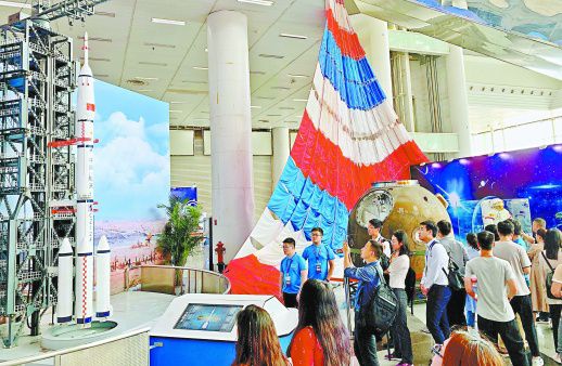 一拨又一拨观众参观了“航天放飞中国梦——庆祝新中国成立70周年航天成就展”,在家门口过了一把航天瘾。来自湖南大学的150名大学生志愿者分布在展馆各处,充当讲解员。在航天科普展区,不仅能看到航天器模型、科普展板,买到太空冰淇淋、太空笔、拼装模型等航天纪念品,还能体验一把航天高科技。轻轻一点完成火箭拼装、燃料加注,两分钟内“发射”一枚火箭;戴上VR,清楚地看到台风如何缓慢变化;登上“梦回神舟”返回舱,体验航天员在太空看到的景象和回归地球的各种身体感受……