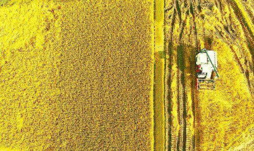 7月16日,江永县潇浦镇溪美村,农民驾驶收割机收割早稻。眼下,该镇2万余亩双季早稻开始成熟,当地农民抓住晴好天气抢收早稻、抢插晚稻,全面开启“双抢”季。潘百旺 摄