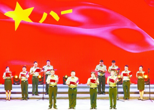 7月30日晚,嘉禾县演艺中心,军民在表演诗朗诵《禾仓军魂》。当晚,该县举行“模范双拥”群众文艺晚会,通过歌舞、小品、大合唱、快板剧、诗朗诵、器乐演奏等形式,歌颂党、歌颂祖国、歌颂军队和人民,抒发军民一家亲的鱼水深情。 黄春涛 摄