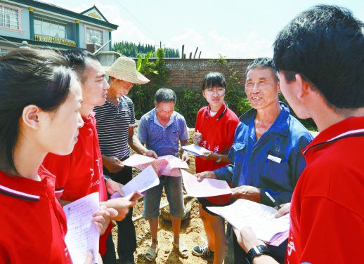 图④ 2018年7月16日,洪江市雪峰镇两溪口村一建筑工地,大学生志愿者在为农民宣讲维权知识,帮助他们增强依法维权意识。(资料图片) 杨锡建 摄