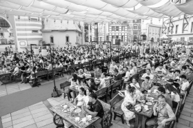 13日上午9点,穿过热闹的DIY月饼现场,不少外国友人正参与月饼制作体验。此时,节庆广场也拉开序幕,“钟鼓齐鸣,百官齐贺”,广场上张灯结彩的红灯笼映照着节日气氛。上午10点,老长沙酒馆的桂花酒可以免费品尝。