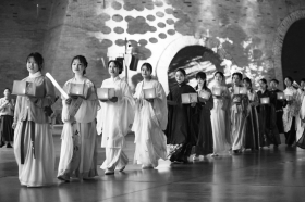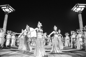 更多的游客,在铜官窑古镇内的街边巡游。白天,古风古韵的展陈遍布街巷,成为游客游玩的热选。入夜后,在金甲武士与仙女的护卫下,精心装扮的“嫦娥仙子”行走穿梭,随时为游客送上月饼等中秋福利;身着盛唐礼服的丽人与金甲武士不时闪现,为游客带来动感欢脱的舞蹈;在石渚风雨桥边,铜官窑古镇为游客悬挂上了道道充满玄机与趣味的灯谜,受到游客们追捧。当月亮初升、夜幕低垂,铜官窑古镇又披上了一层华丽的灯光外衣,石渚湖边,人们点燃千盏花灯轻置湖面,将“相思、团圆、祈福”等思绪寄往远方。在历史上风靡的拜月仪式,随后也在铜官窑古镇里得到了复活,伴随霓裳羽衣舞翩翩,古镇奉上安放有月饼与水果等食物的团圆餐,表达对月神的敬仰之情,共同祈求月人两团圆。