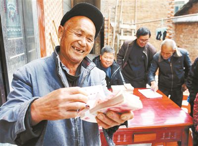 1月13日,宁远县水市镇易友农机专业合作社社员肖中美高兴地领到了分红款。乐水旺 摄