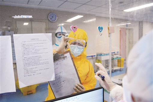 2月16日晚11时许,湖北省黄冈市大别山区域医疗中心,护士许依和同事通过手势和文字进行交流。通过这段时间的工作,她们已非常默契,结下了深厚的战友情谊。 湖南日报记者 辜鹏博 摄