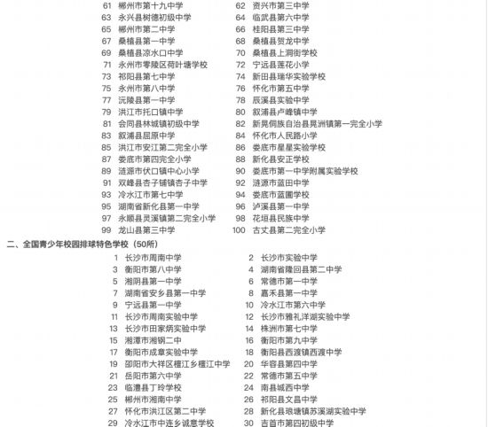 经过学校申报、各市州教育(体)局审核、省教育厅组织专家评选等流程,最终拟推荐湖南长沙同升湖实验学校等100所学校为2020年全国青少年校园篮球特色学校,长沙市周南中学等50所学校为2020年全国青少年校园排球特色学校,长沙市天心区教育局为全国青少年校园篮球“满天星”训练营,株洲市二中附属小学 、长沙市天心区青雅丽发学校、 浏阳市沙市镇赤马初级中学、长沙市岳麓区潭州实验小学等4所学校为全国青少年校园冰雪运动特色学校,株洲市二中附属小学、湘潭市岳塘区湘机小学、怀化市湖天中学、衡阳市珠晖区泉溪村小学等4所学校为北京2022年冬奥会和冬残奥会奥林匹克教育示范学校。