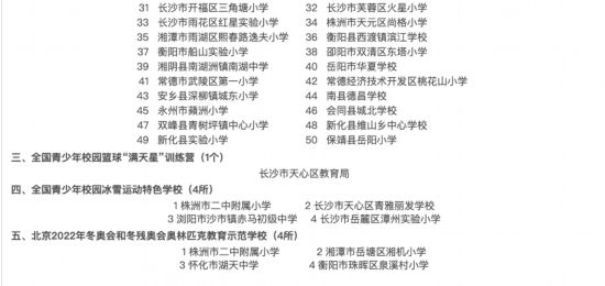 近日,湖南省教育厅在官方网站上公布了全国青少年校园篮球特色学校、全国青少年校园排球特色学校、全国青少年校园篮球“满天星”训练营、全国青少年校园冰雪运动特色学校、北京2022年冬奥会和冬残奥会奥林匹克教育示范学校推荐对象遴选结果的公示名单。公示期截至今日(5月29日)。