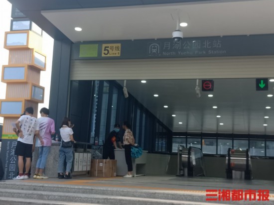 (长沙地铁月湖公园北站5号出入口,长沙地铁3号线、5号线可以在这里实现换乘。6月27日下午,不少附近居民向地铁工作人员咨询3、5号线运行情况。记者 陈月红 摄)
