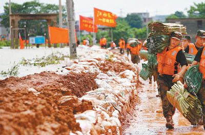 11日,武警战士在江西鄱阳县鄱阳镇江家岭村搬运抗洪物资。新华社记者 周 密摄