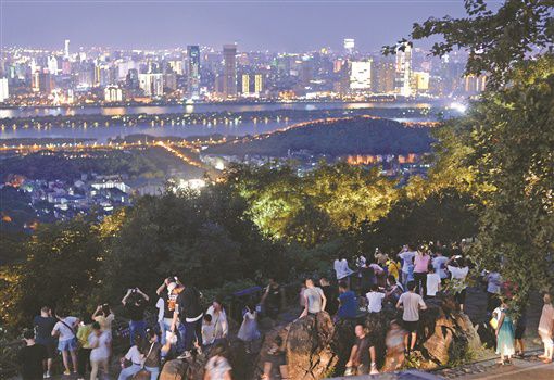 8月8日晚,长沙市岳麓山风景区,众多游客在山顶欣赏星城夜景,纳凉消暑。高温晴热天气,城市“绿肺”岳麓山,吸引了众多市民、游客纳凉赏景。 记者 李健 摄