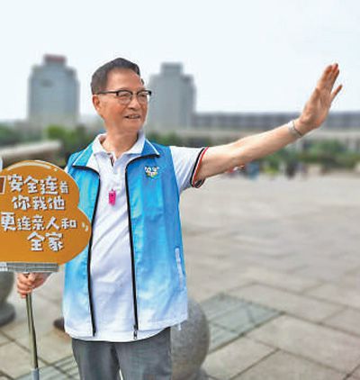 早上7点半,68岁的刘喜华身穿蓝马甲,挂着口哨,手举文明劝导牌,在黄河路参加交通文明劝导志愿服务。