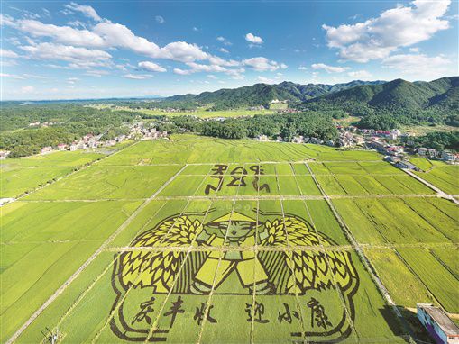 8月15日,远眺衡阳县库宗桥镇华山村稻田巨幅丰收图,气势磅礴。该图由紫、白、黄三色水稻以“庆丰收、迎小康”为主题“绘制”,图案占地52亩,分别由“丰收”图案和“乡”字甲骨文、“庆丰收、迎小康”字样组成。近年,当地推进农业与旅游产业深度融合,走出了一条旅游经济富民路。 湖南日报首席记者 郭立亮 通讯员 刘欣荣 摄影报道