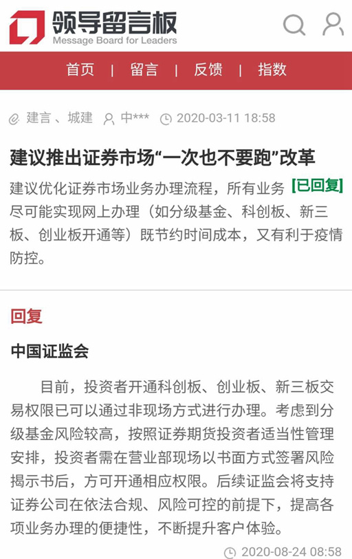 针对“优化证券市场业务办理流程,所有业务尽可能实现网上办理”的网友留言,证监会回复表示,后续将支持证券公司在依法合规、风险可控前提下,提高各项业务办理的便捷性,不断提升客户体验。