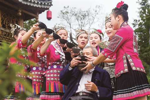 10月1日,游客在体验侗族迎宾礼节“高山流水”。当天,通道侗族自治县双江镇芋头古侗寨,侗族同胞为游客表演丰富多彩的民俗节目,欢度国庆、中秋佳节。 尹序平 摄