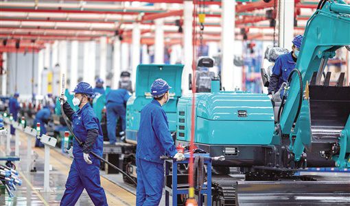 山河智能挖机组装车间产销两旺,一片繁忙。