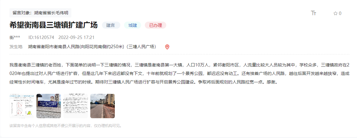 人民网长沙12月8日电 (吴茜薇)“三塘镇是衡南县第一大镇,人口10万人,紧邻衡阳市区,人流量比较大人员较为其中,学校众多。三塘镇政府在2020年提出过对人民广场进行扩容,但是这几年下来迟迟都没有下文。”近日,一名网友通过人民网“领导留言板”,向湖南省省长毛伟明反映当地问题。