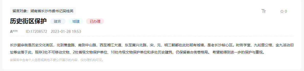 “长沙潮宗街是历史文化街区,北到营盘路、南到中山路、西至湘江大道、东至黄兴北路,宋、元、明三朝都在此处砌有城墙,是老长沙核心区。”近日,网友在“领导留言板”上建言,希望长沙潮宗街能够得到进一步的保护与重视。