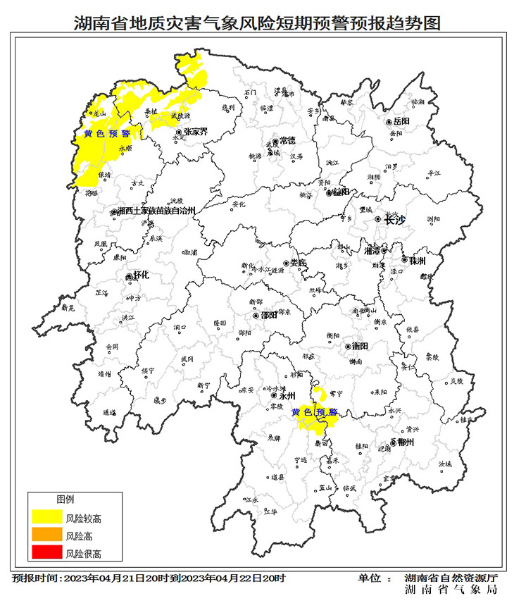 根据地质灾害成灾规律和孕灾条件,结合4月21日短期气象预报情况,湖南省自然资源厅与省气象局联合会商得出如下结论:自4月21日20:00至22日20:00,受降雨影响,湘西北、湘南部分区域发生突发性地质灾害风险较高(黄色预警)。