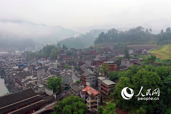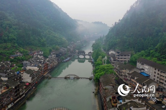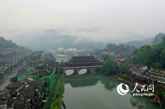 人民网湖南5月16日电 (记者王天乐 车柯蒙)湖南省湘西土家族苗族自治州凤凰县境内,紧邻沱江的凤凰古城在雨后云雾缭绕,宛若画卷。