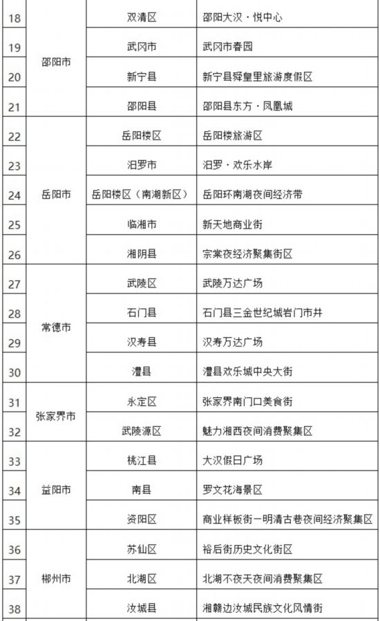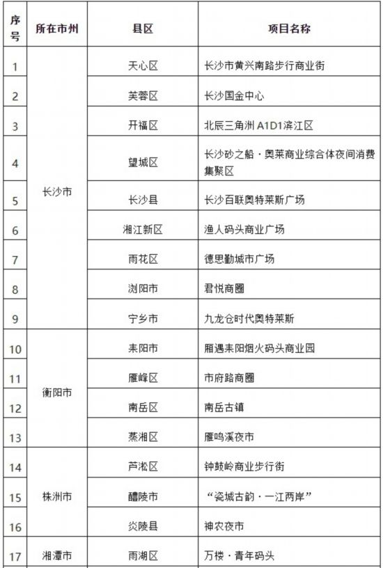 为推动“夜经济”高质量发展,进一步扩消费促就业,日前,经县(区、市)自愿申报、市州商务局初审推荐,湖南省商务厅组织专家评审,拟评选“长沙市黄兴南路步行商业街”等50家为首批湖南省夜间消费聚集示范区,现予以公示。